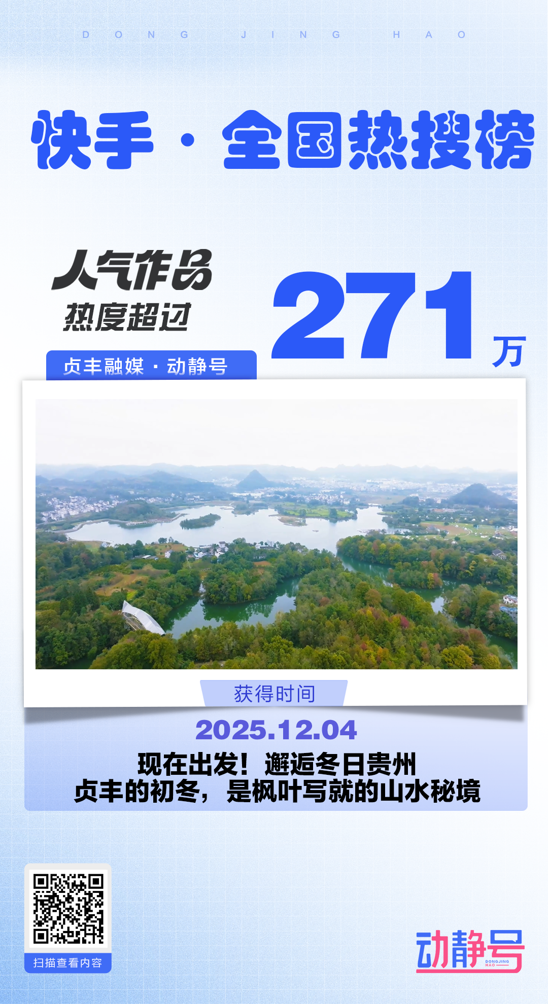 动静号编辑基于贞丰融媒提供的素材精心制作稿件《现在出发!邂逅冬日贵州丨贞丰的初冬,是枫叶写就的山水秘境》,获得快手全国热榜,收获271万热度。