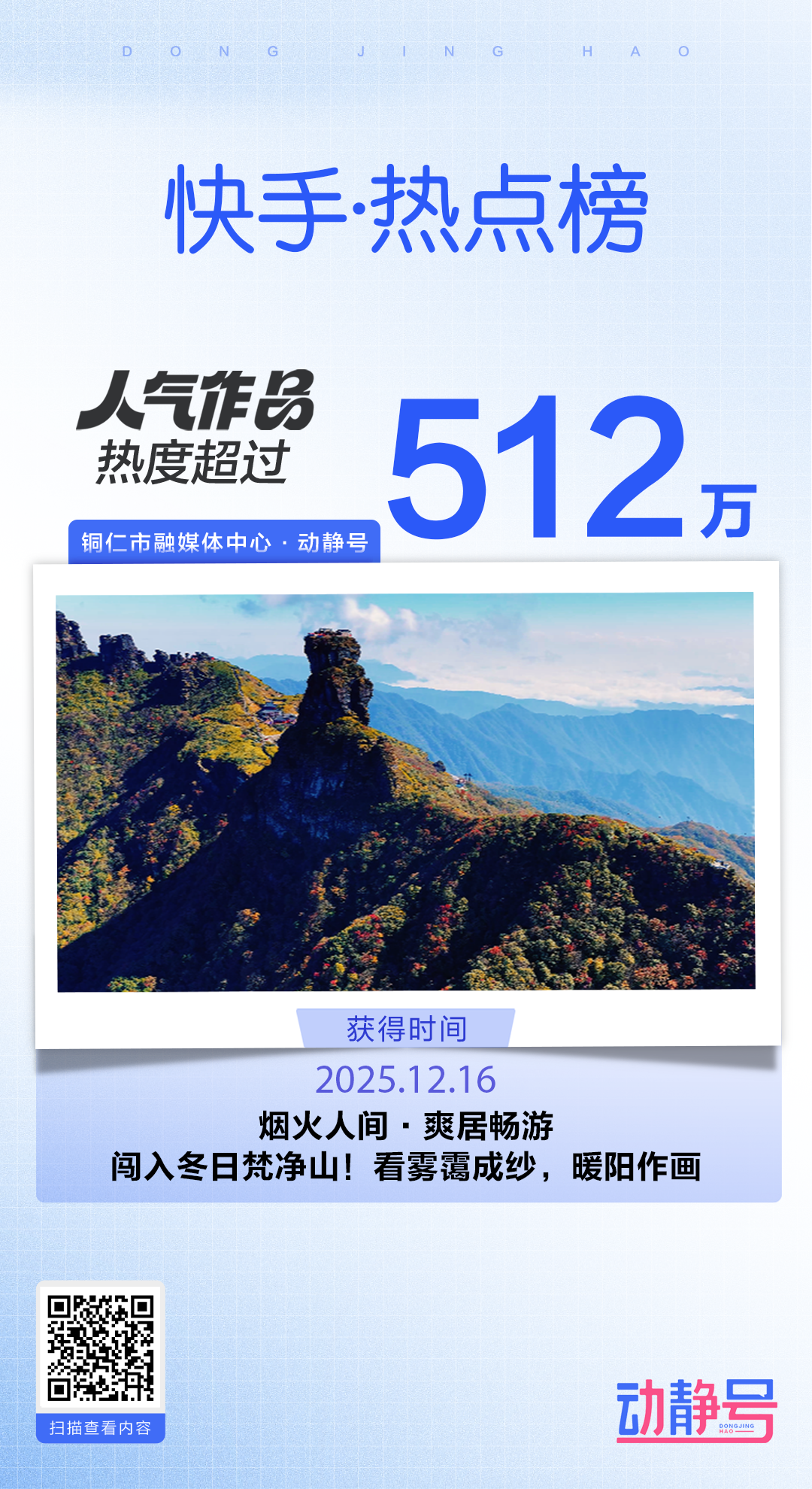 动静号编辑基于铜仁市融媒体中心提供的素材精心制作稿件《烟火人间·爽居畅游|闯入冬日梵净山!看雾霭成纱,暖阳作画》,获得快手热点榜,收获512万热度,并被学习强国总平台选用。
