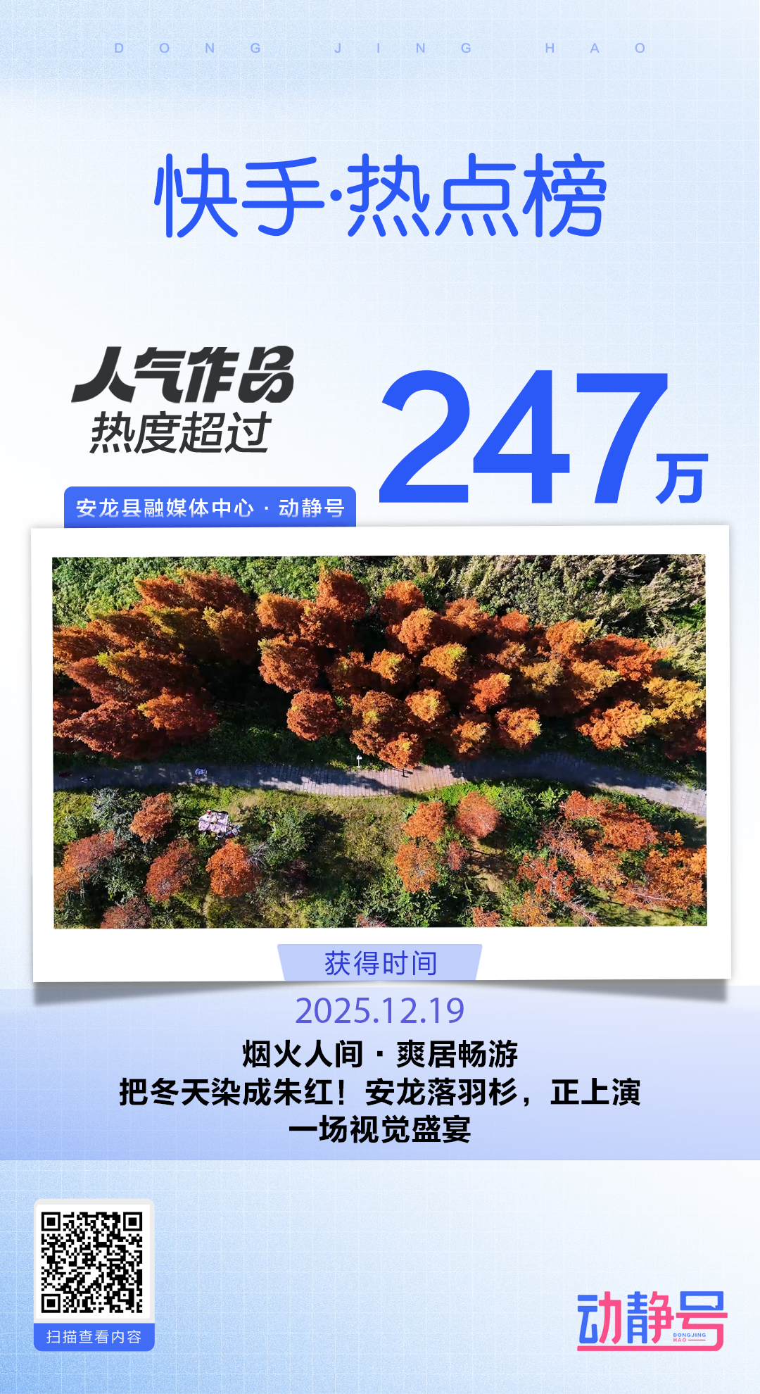动静号编辑基于安龙县融媒体中心提供的素材精心制作稿件《烟火人间·爽居畅游丨把冬天染成朱红!安龙落羽杉,正上演一场视觉盛宴》,获得快手热点榜,收获247万热度,并被学习强国总平台选用。