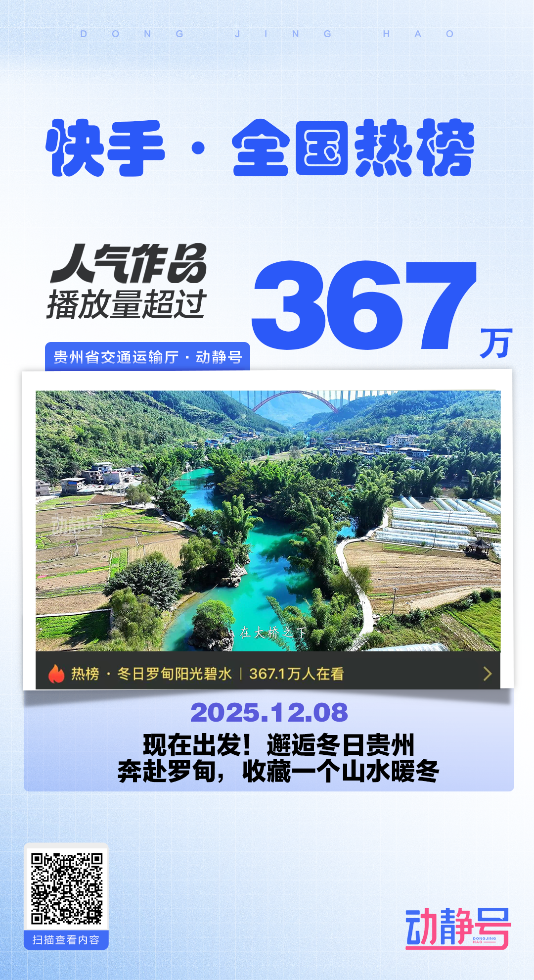 动静号编辑基于贵州省交通运输厅提供的素材精心制作稿件《现在出发!邂逅冬日贵州:奔赴罗甸,收藏一个山水暖冬》,获得快手全国热榜,收获367万热度,并被学习强国总平台选用。