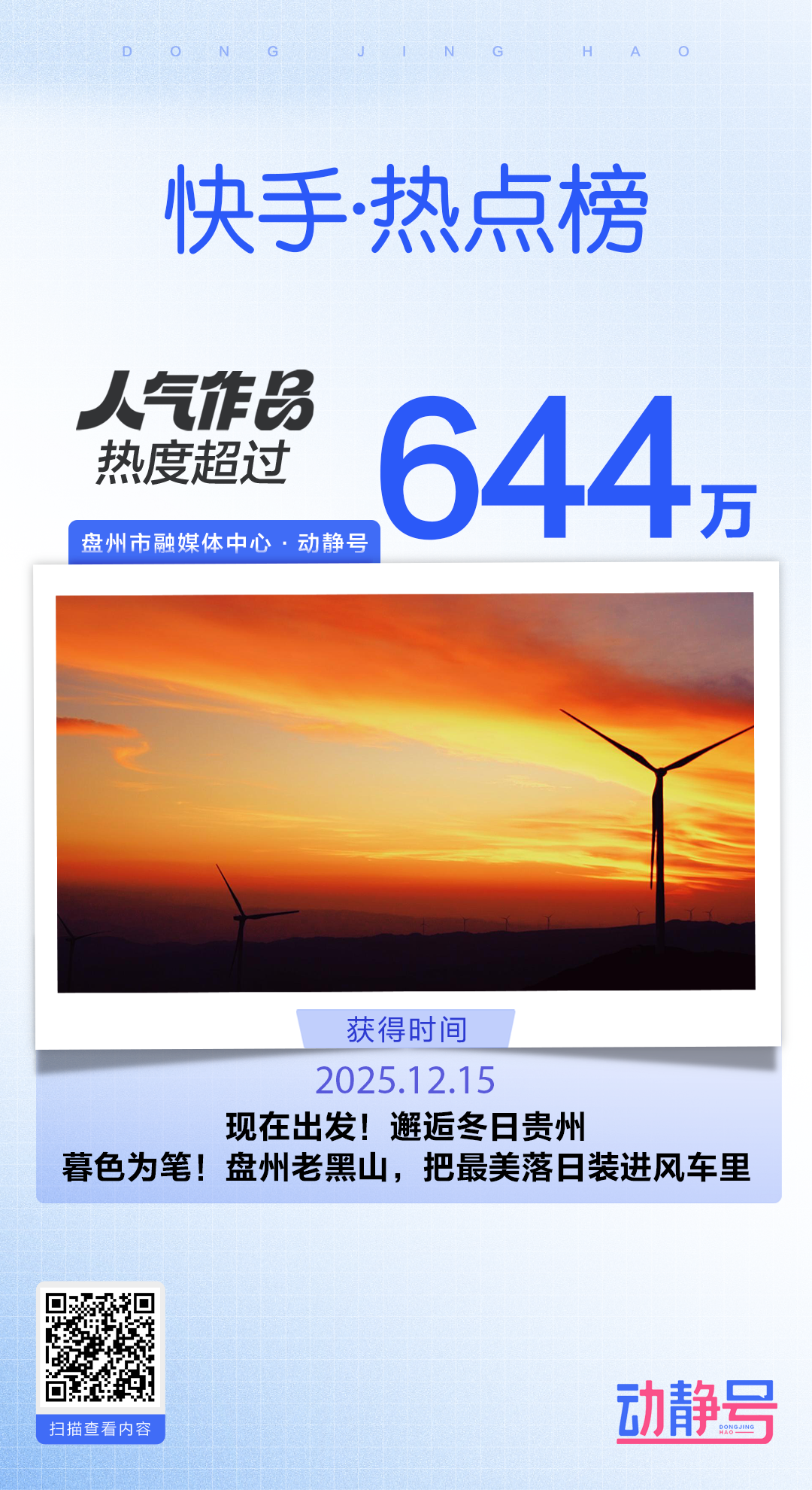 动静号编辑基于盘州市融媒体中心提供的素材精心制作稿件《现在出发!邂逅冬日贵州丨暮色为笔!盘州老黑山,把最美落日装进风车里》,获得快手热点榜,收获644万热度,并被学习强国总平台选用。