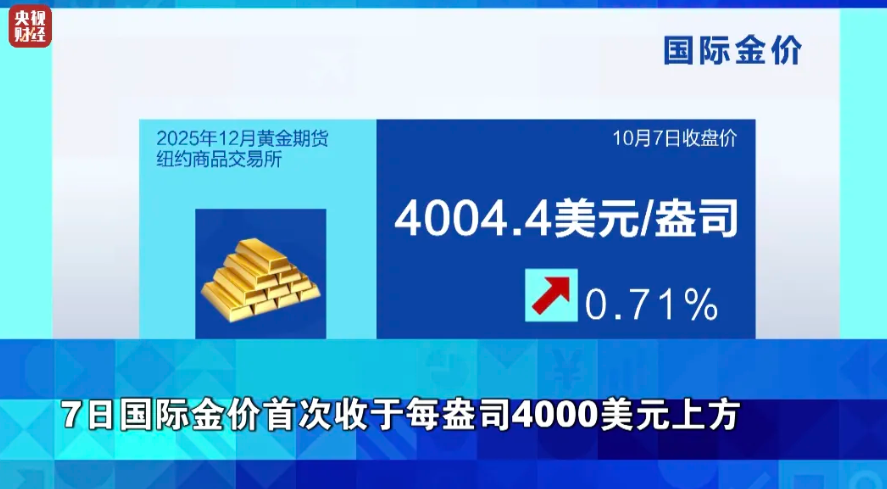 据外媒报道,10月8日,现货黄金价格突破每盎司4000美元大关,创历史新高。分析人士认为,美国联邦政府“停摆”引发避险情绪升温,助推金价走势。此外,法国、日本等国的政坛变动加剧投资者担忧,推动金价上涨。