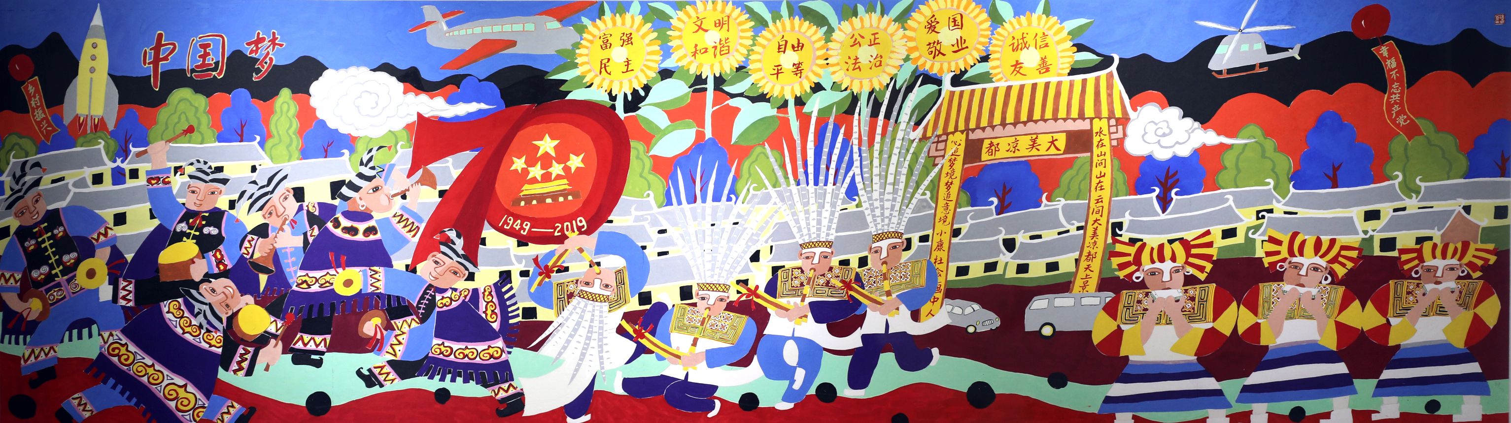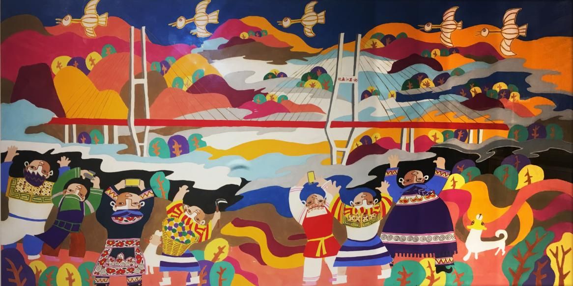 这幅作品是水城农民画传承人徐源带领自己的创作团队绘制的巨幅农民画。整幅作品以中国红为主色调。画面色彩斑斓、题材包罗万象,融入了苗族、彝族、布依族等少数民族元素。整幅作品长3.70米、高1.46米,由9名画师耗时30余天创作完成。