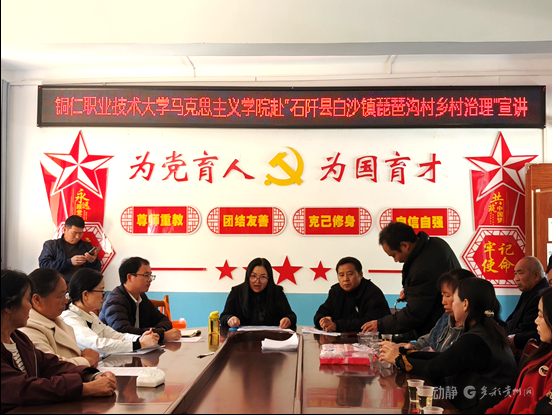 为深入宣传贯彻习近平总书记在贵州考察时的重要讲话精神,让党的创新理论扎根乡村沃土,近日,铜仁职业技术大学马克思主义学院乡村文化服务团队廖淋森、翁艳、曾荣、田宏果、李明林五位教师奔赴铜仁市石阡县,在龙井乡孔石化村、白沙镇琵琶沟村、甘溪乡泥山村连续开展主题宣讲,并以瞻仰红色旧址深化思想洗礼,圆满完成了一次知行合一的服务实践。