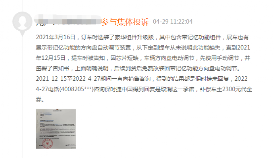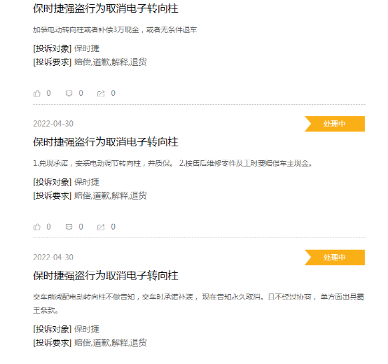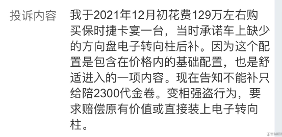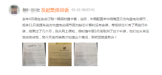 一车主表示,自己在去年4月底订购了一辆保时捷卡宴,当时车辆配置单中明确显示方向盘电动调节,不过在去年11月底提车时,得知方向盘电动调节因为缺芯片暂时没有安装,等后续芯片有了再进行补装,结果过了几个月,他从网上得知,保时捷中国3月底取消了这个补装,但是官方并未告知他这一消息,而是他询问销售才得知了情况,认为这“明显就是欺诈”。此外,不少车主投诉保时捷“强盗行为”,希望保时捷加装电动转向柱或者赔偿3万现金。