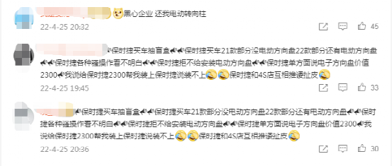 而官方微博的状态下,也有不少网友评论“还我电动转向柱”,据悉4月27日晚,保时捷官方微博直播中也遭到大批保时捷车主刷屏式维权……
