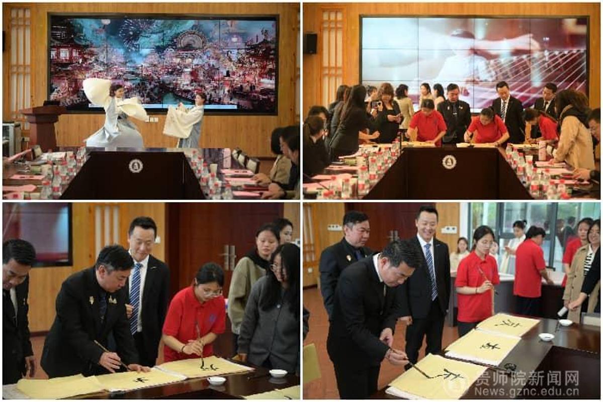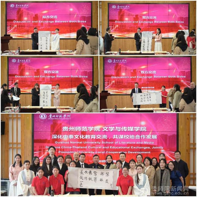 座谈会上,学校汉语国际教育专业学生代表进行了精彩的中华才艺展示,涵盖传统舞蹈、书法等,展现了贵州师范学院学子扎实的文化素养与专业风采,赢得泰方代表一致好评。展示结束后,学生代表现场将精心创作的书法作品赠予泰方代表团,以墨香传递情谊,表达对中泰友好交流的美好祝愿。