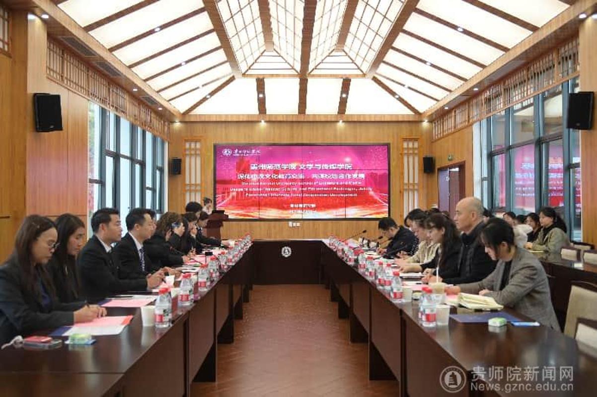 4月1日上午,泰国北榄府邦孟区市政办事处一行莅临贵州师范学院开展教育交流访问。座谈会前,代表团一行参观了贵州师范学院校园及文学与传媒学院,随后在印山书院山水讲堂举行交流座谈。