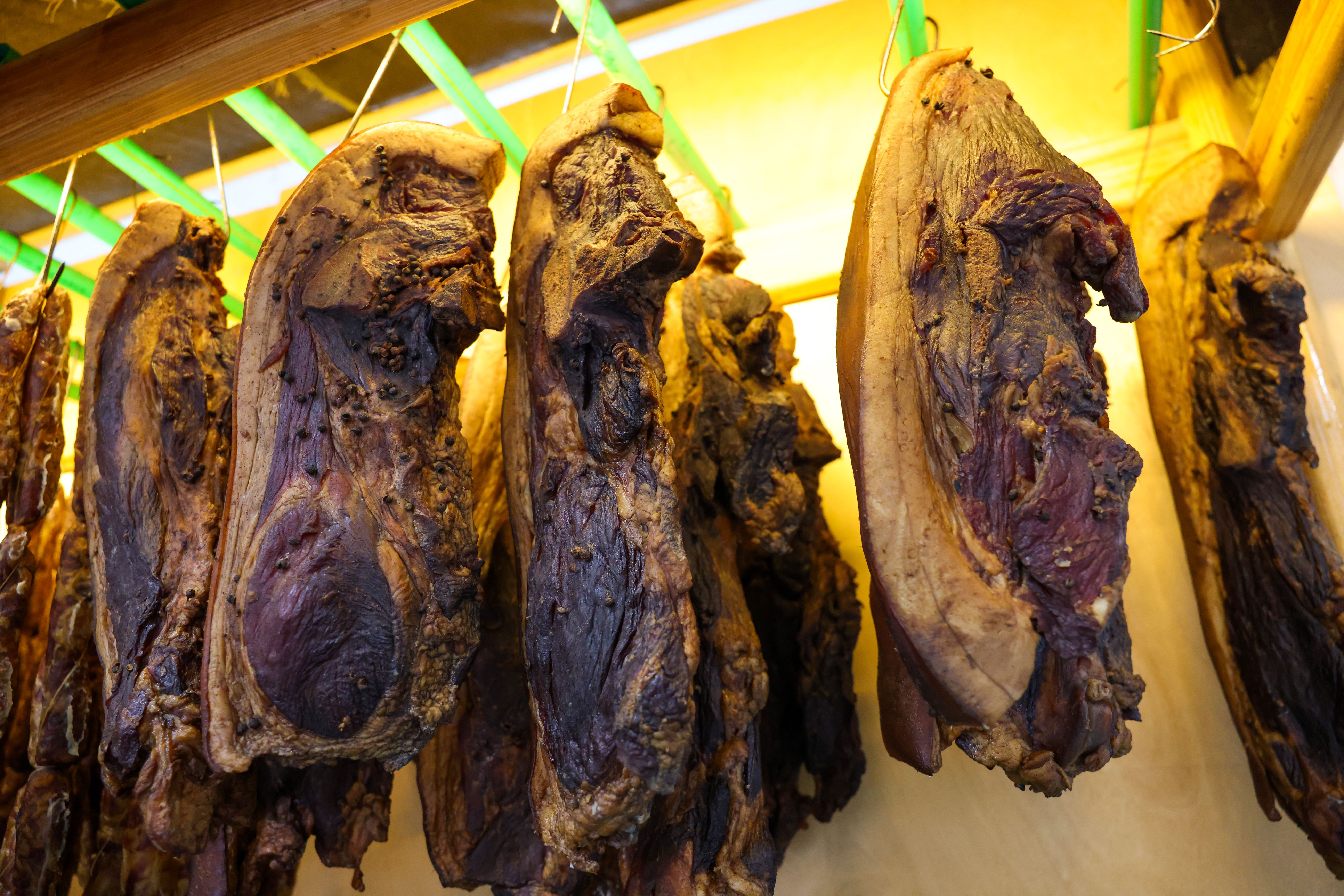 土猪肉宰杀清理后,分割成约4到5斤重的长块,涂抹炒制过的花椒盐,腌制5到7天,期间翻料2到3次。等腌制入味后,上架用柏树枝和青杠木烟熏15到30天不等,待味道完全渗透到猪肉内便可下架出炉。
