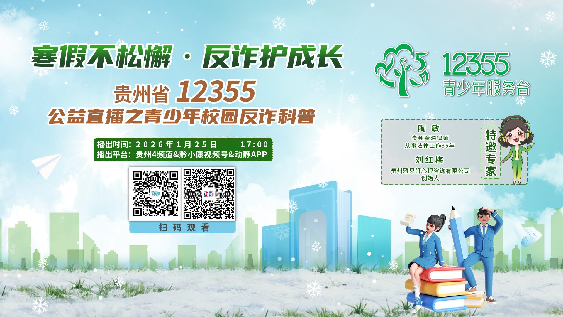 为帮助家长和孩子识别寒假高发骗局,贵州省12355青少年服务台联合贵州广播电视台大健康事业部推出:寒假不松懈,反诈护成长——贵州省12355 公益直播之青少年校园反诈科普主题直播。