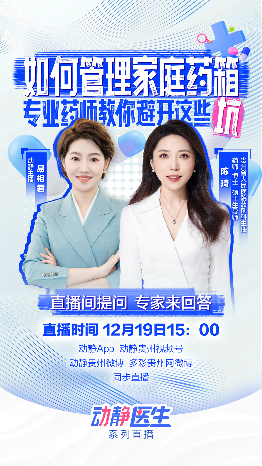 本周【动静医生】将邀请药师、药学博士、硕士生导师,贵州省人民医院药剂科主任陈琦做客直播间,系统讲解家庭用药中的关键问题与实用技巧。