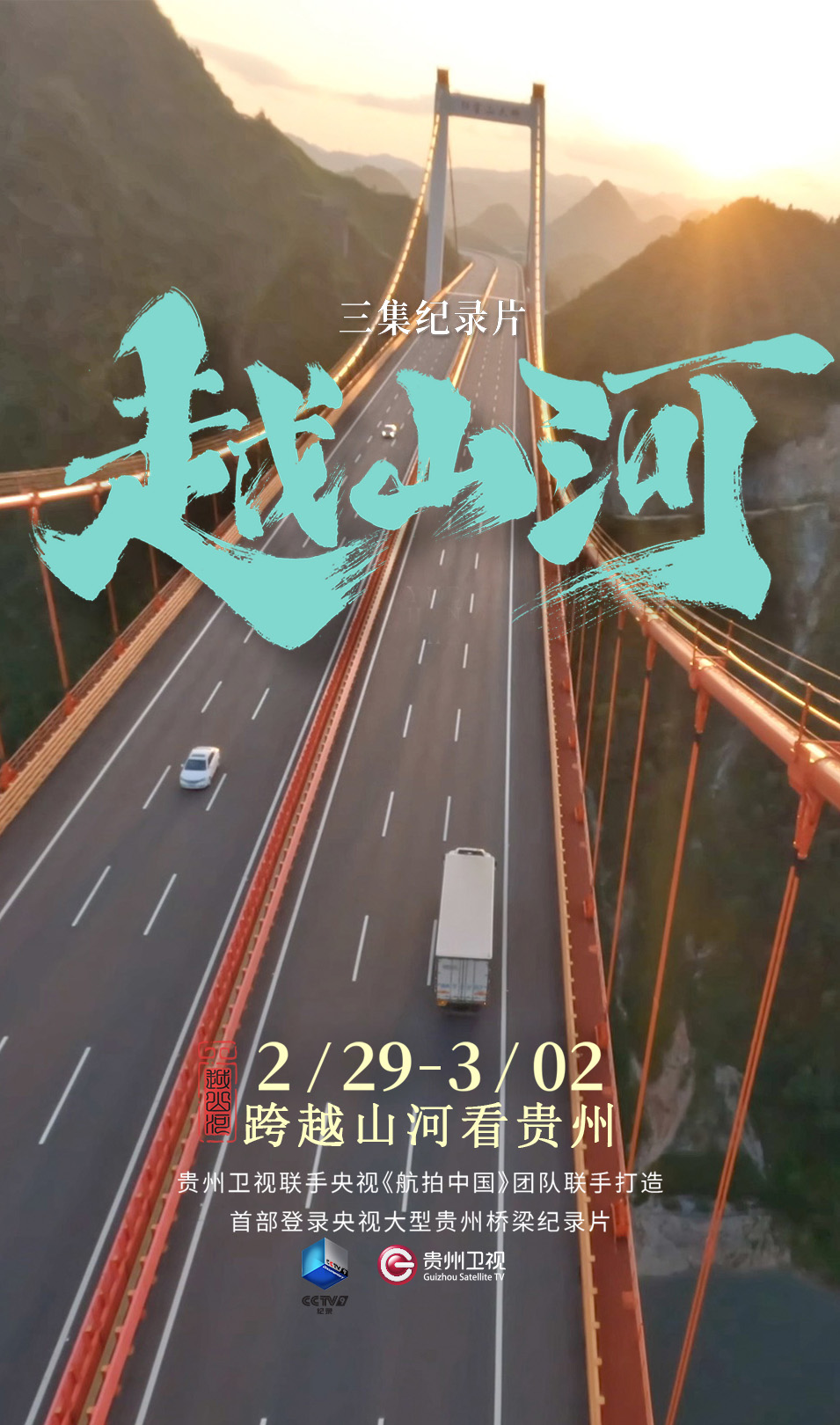 一座桥,连接了山的两端、河的两岸,也连接了过去与现在,贵州与未来。纪录片《越山河》立意于“从万桥飞架看中国奋斗”,由贵州省交通运输厅、贵州广播电视台卫视中心与《航拍中国》团队联合精心打造,是一部深度反映贵州省交通桥梁建设,全景展现贵州发展巨变和中国精神的大型纪录片。