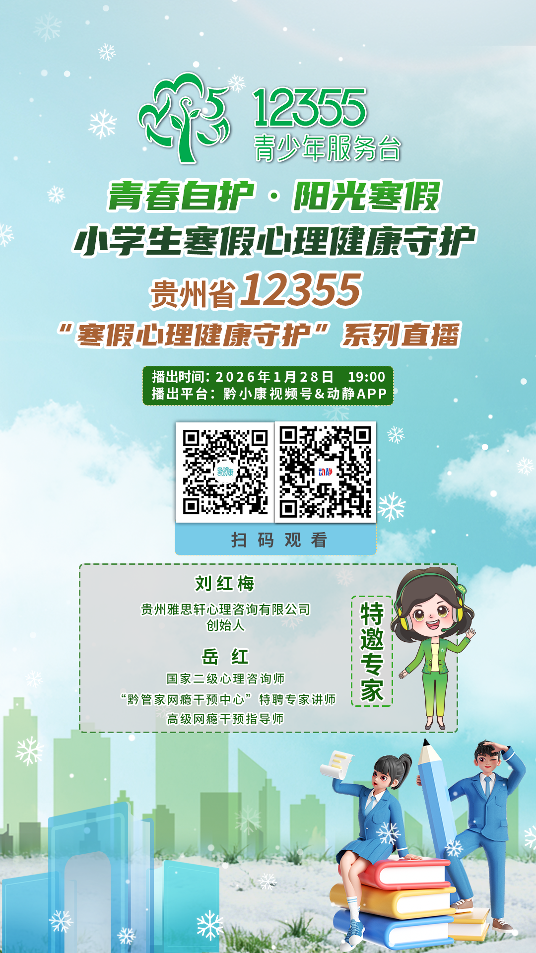 为帮助小学生科学规划假期生活,缓解假期常见的情绪困扰、作息紊乱、沉迷电子产品等问题,让孩子们在趣味陪伴中收获成长,在安全守护中快乐前行,贵州省12355青少年服务台联合贵州广播电视台大健康事业部推出:“青春自护·阳光寒假”主题直播。