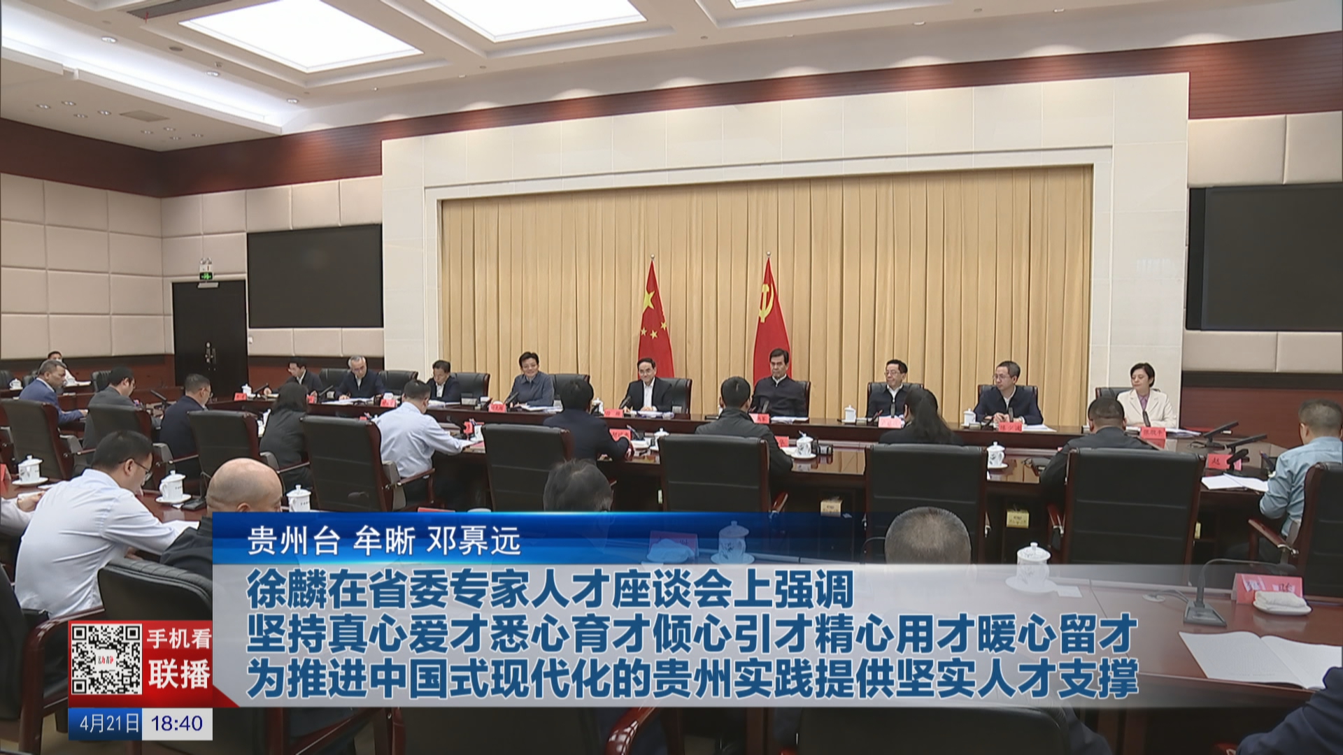 4月21日是贵州“人才日”,省委召开专家人才座谈会。省委书记、省人大常委会主任、省委人才工作领导小组组长徐麟主持会议并讲话。他强调,要深入学习贯彻党的二十大精神和习近平总书记关于做好新时代人才工作的重要思想,坚持把人才工作摆在突出位置,与高质量教育、高水平科研、产业发展和区域重点建设相结合,坚持真心爱才、悉心育才、倾心引才、精心用才、暖心留才,奋力推进人才大汇聚,为推进中国式现代化的贵州实践提供坚实人才支撑。