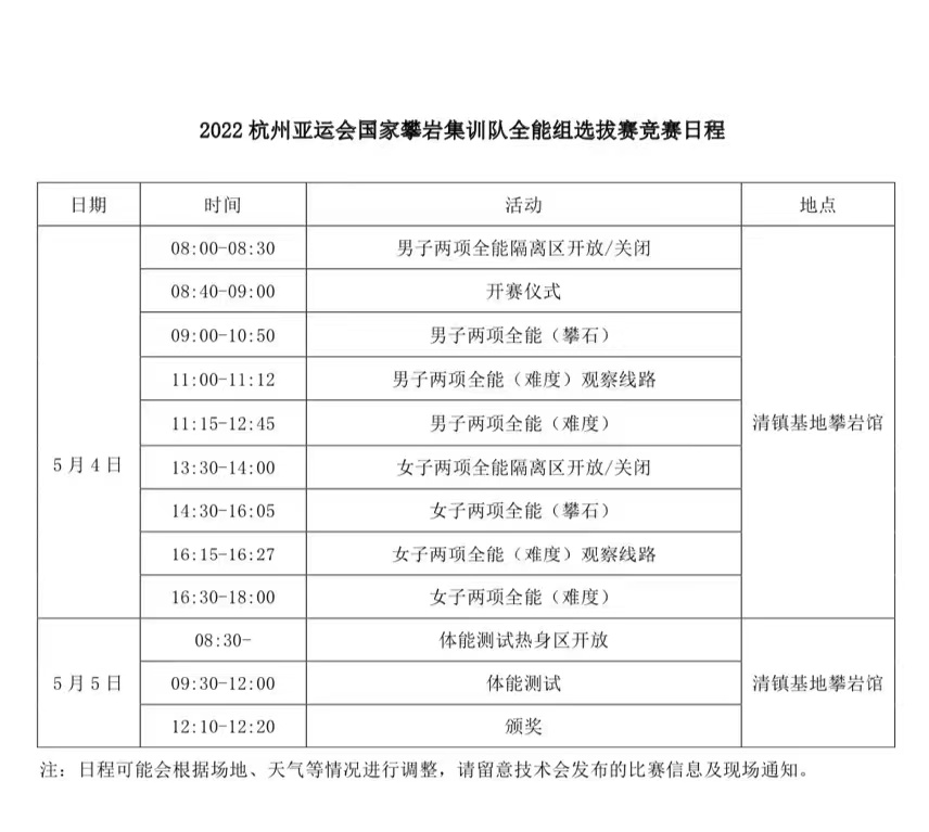 2022杭州亚运会国家攀岩集训队(全能组)选拔赛,将于5月4日在贵州省清镇市体育训练基地攀岩馆举行。比赛设男、女两项全能和体能测试。比赛将采取现场“零观众”、网络直播形式进行。早上直播时间:5月4日9:00-12:45。